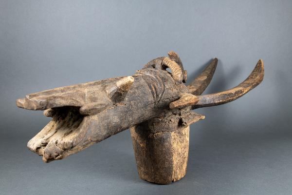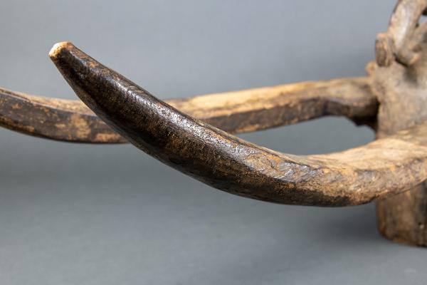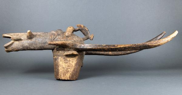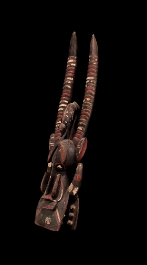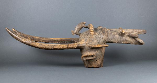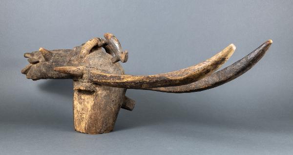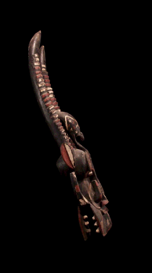 | Nasolo mask from the Kagba ritual Senufo masks like this which were not worn over the head were instead attached to the front and top of a structure consisting of a tent like structure of reeds, covered with ornamentally painted mats or blankets which requires two dancers to move it. The structure is referred to as 'Nasolo' which translates to "elephant-ox". Mounted on the structures front end is a carved head with various animal features: long antelope horns, a gaping mouth studded with teeth, and backward - curving tusks. Older examples of the Nasolo, made in the 1950's prior to the iconoclastic ravages of the Massa religious movement, are marked by a strikingly simple composition. More recent versions, in contrast, show great elaboration, being ornamented with figurative and symbolic elements and brightly painted.  |