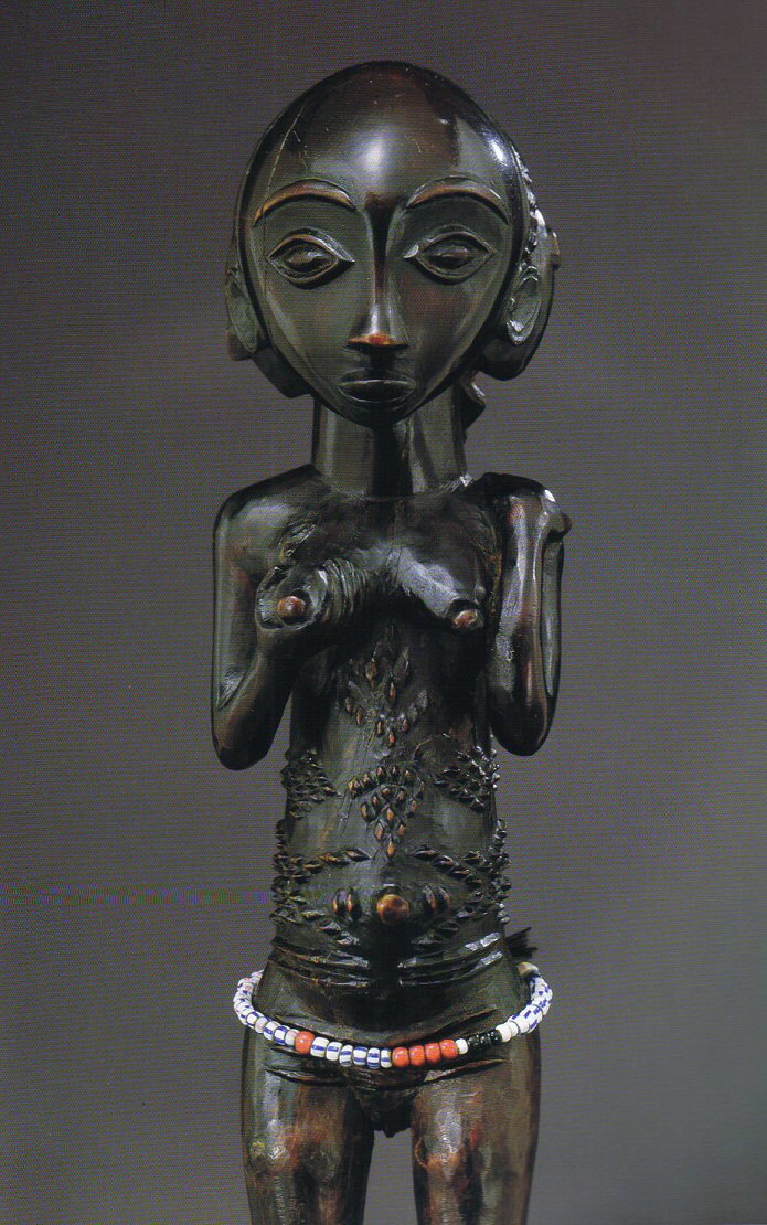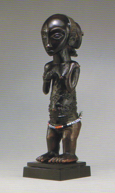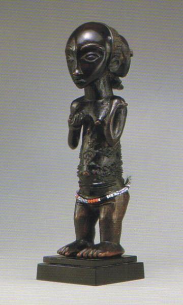 | Lot 231 - A superb Luba female figure Estimate $100,000 - $150,000 SOLD for 222,500 USD Standing, and leaning slightly forward, with wedge-shaped feet and finely articulated toes beneath bent legs and a protruding abdomen, with a deeply grooved spinal column, the torso tapering beneath conical protruding breasts and rounded shoulders with raised articulated shoulder blades, her right hand holding her breast and her left resting on her shoulder, beneath a cylindrical neck and large spherical head with exceptionally fine facial features including open almond-shaped eyes and a domed forehead, and wearing a coiffure of multiple braided rows and a backswept cruciform circular section, fine raised scarification on the torso; exceptionally fine and varied dark brown patina. Provenance: Merton Simpson, New York Nancy and Richard Bloch, California Morris Pinto, Paris This superb free-standing Luba female is so distinct stylistically that the hand can be clearly identified—the extraordinary domed forehead, the raised open oval eyes, the elaborate scarification patterning and the treatment of the coiffure form a cohesive style. Neyt (1994: 126) places other published works by the same hand within the 'Atelier of the master of Mulongo'—which was active not far from the confluence of the Lovoi and Lufira Rivers. The clarity and sensitivity of the work on this figure and the other known examples clearly show the hand of a master carver. For related examples by the same hand see Neyt (ibid:l26-l27) for a staff of authority by the same hand and (188) for two double figure neckrests, one in the National Museum of African Art (inv. 86-12-14) and another in the Museum of Mankind, London (inv. 1956 AF 27-270). See also Roberts and Roberts (1996: 197) for a bowl figure in the Museo Carlos Machado, Ponta Delgada (inv. no. 256) as well as another in the Museum of Natural History New York (inv. no. 2432B) (Neyt: ibid: 28). The elaborate and finely-carved scarification patterns place this figure firmly in the eastern Luba tradition. This type of patterning is a particular design that one sees again and again in Luba art. Roberts and Roberts (1996: 98-112) discuss in great detail the meaning of these elaborate markings including the names and forms of specific patterns and how they constitute a vocabulary. The gesture of the arms is highly inventive. The cupping of the breast probably relates to the meaning of other Luba objects in which a female figure gestures to her breasts—a reference to the role women play as keepers of the secrets of Luba royalty. However, the left hand resting on the shoulder is highly unusual—and its meaning has yet to be decoded. Both gestures, as well as the inventive iconography on the bowl figure in the Museo Carlos Machado suggest this carver was not only highly skilled, but extremely creative. |