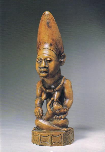 | Property from a West Coast Collector Lot 295 A superb Kongo maternity figure in the form of a female figure seated crosslegged on a faceted base incised with a geometric pattern encircling the rim, and cradling a child suckling her breast, the thick neck supporting the delicately carved head with full naturalistic lips, broad flattened nose and heavy lidded eyes, back-set ears, and wearing a high peaked coiffure, carved bracelets, necklace and waist band, raised scarifications on the back, a brass tack on the lower part of the right arm; fine, honey brown patina. height 11 3/8 in. (28.9cm.) Published: Lehuard, Art Bakongo, 1989: 580, figure K-6-1-2 Exhibited: Los Angeles, California, Mother and Child in African Art, Los Angeles County Museum of Art, May 12, 1985-June 7, 1986. New York, Mother and Child in African Sculpture, The African-American Institute, October 21, 1986-February 28,1987. Estimate $25,000-35,000 SOLD for $51,750 USD |