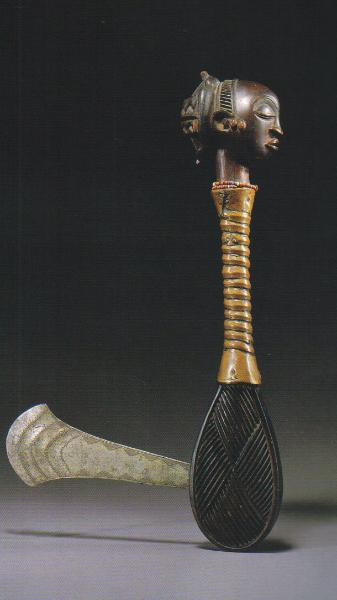 | Lot 53- A superb Luba ceremonial adze the handle in the form of a delicately carved human head with beads encircling the neck, and wearing an elaborately carved typical backswept cruciform coiffure, supported by a handle encircled by a flattened strip of copper affixed with metal staples, and flaring to a wooden oval-shaped head of the adze deeply incised with crosshatch motif terminating in an flat iron blade decorated with lightly incised geometric motif; fine reddish brown patina. height 16 1/4in. (41cm.) Provenance: Collected before the first World War by Heinrich Brand, an officer in the German Colonial Army. By descent through the family. Published: Schadler, 1994: 27 Schadler, 1997b: 342 Exhibited: Vienna, 1994 Munich, 1997 Burgrieden-Rot, 1998 Cf. Roberts and Roberts, 1996: catalogue 12 for a related example. See also Nooter-Roberts in Tervuren (1995:figure 165) for a ceremonial staff, probably by the same hand or same atelier, registered at the museum in 1932. As Roberts and Roberts note, these ceremonial axes belonged to the most important members of society, from royalty and titleholders to female spirit mediums and diviners. They might be worn over the shoulder or wielded in dance to signify rank and power of an individual. Used in initiation ceremonies, the axe symbolically clear(s) the path leading to civilization.' Estimate $20,000-25,000 SOLD for $156,500 USD |