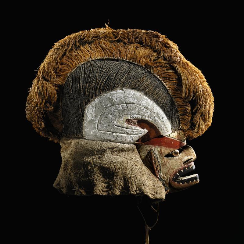 | LOT 26 PROPERTY FROM A WEST COAST PRIVATE COLLECTION A NEW IRELAND, MALANGAAN, MASK Estimate 8,000—12,000 USD MEASUREMENTS height 18 1/2 inches 47cm DESCRIPTION of helmet-shaped form, the wooden face mask with open mouth and inset shell eyes (turbo petholatus) beneath the tall multi-tiered and crested headdress composed of fiber and cloth; aged surface with areas of lime and white, red and black pigment. |