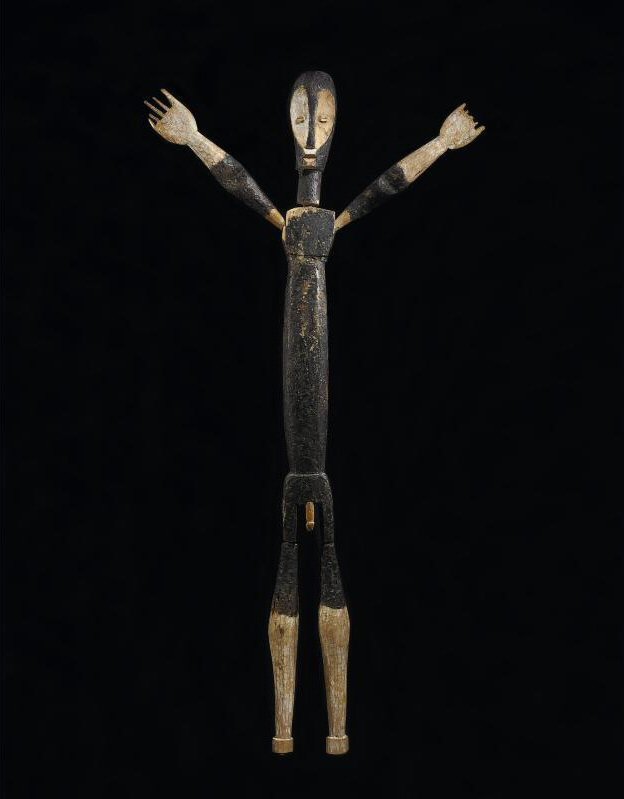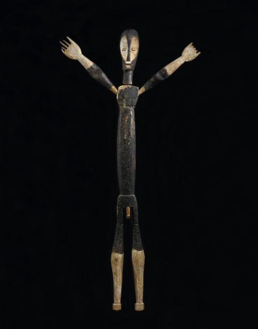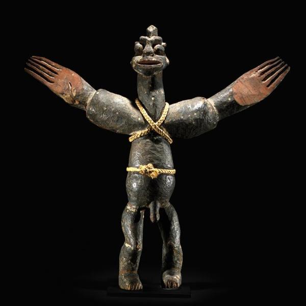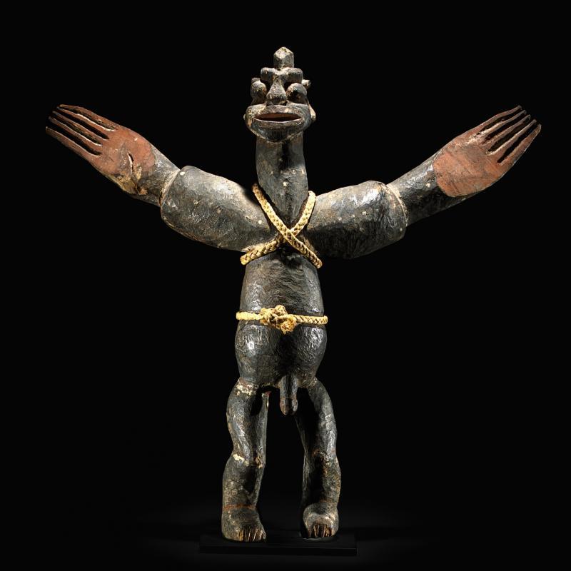 | LOT 108 PROPERTY FROM THE RAYMOND E. BRITT FAMILY COLLECTION A RARE LENGOLA FIGURE estimate 50,000—70,000 USD MEASUREMENTS height 60 1/2 in. 153.7cm DESCRIPTION ubanga nyami, of overall elongated articulated form, the lenticular legs inserted at the hips of the torso with pendant phallus and gently flared at the center beneath the square chest with arms inserted at the sides and splayed outward with pointed fingers, the head inserted at the top with a domed and a heart-shaped facial plane, with raised coffee-bean eyes; the whole blackened and encrusted with large areas of kaolin. PROVENANCE Alvin Abrams, New York, November 1979 LITERATURE AND REFERENCES Bradley 1982: 11, catalogue number 7, catalogue of the exhibition, Notre Dame, Indiana, The Snite Museum of Art, 1982 Robbins and Nooter 1989: 491, catalogue number 1270 CATALOGUE NOTE Large Lengola figures of veneration, such as the Britt figure, are known as ubanga nyama. They were erected in the center of a village after the death of a chief. These minimalist sculptures are thought to represent the Lengola’s founding ancestor, Suway. Such figures are rare (Neyt 1981: 38) and their exact function is unknown (Biebuyck 1986:240). Biebuyck suggests the figures allowed invocations to be made, specifically by men (1977:54). The figures can be disassembled, possibly for storage purposes or portability, as they are used infrequently. Typically, ubanga nyama are of elongated proportions, with a small, articulated chest above a long trunk issuing lenticular limbs. The figures also display cruciform arms framing a concave, heart-shaped face. Most figures were painted at some time. Stylistically, Lengola figures share formal qualities with the art of their neighbors, the Lega (Biebuyck 1986:240). The distinctive treatment of the face, the concave heart-shaped and linear features is characteristic of both groups. For closely related figures see Neyt (1981: 42, figure II.12); Maurer (c 1991: 97, catalogue number 81) for a figure from the Mestach Collection, and Gillon (1979: 138, figure 169) for another from the MRAC, Baselitz (2003, figure 97). The Baselitz figure, like the Britt figure, displays dramatic contrast with a light patina on the face and lower limbs. |