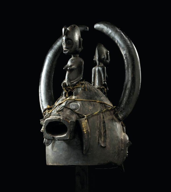 | LOT 60 PROPERTY FROM A EUROPEAN PRIVATE COLLECTION A RARE SENUFO HELMET MASK estimate 50,000—70,000 USD MEASUREMENTS height 15 3/4 in. 40 cm DESCRIPTION kponiugo, the helmet of hollowed form and complex composition, with a transverse sagittal crest, composed with two animal snouts projecting to either side, each with squared hollowed mouth, raised linear nose, and incised circular eyes, one flanked by a pair of raised lanceolate ears, and the other by asymmetrical kpelie masks, and supporting two female figures above, carved from the same piece of wood, each with shortened legs, a distinct helmet-shaped head with coiffure rising to a crest, and forward-protruding mouth baring teeth, and framed by a pair of horns with indigenous restoration, the whole encircled by a band with pendant magical elements; fine and varied deep black patina. PROVENANCE René Rasmusseum Collection Acquired from the above by Dr. F. Kerbourc'h, 1970 Andre Schoeller, Paris, 1994 Private Collection, Paris LITERATURE AND REFERENCES Galerie Alain de Monbrison, Collection Kerbourc'h: 1993:48, catalogue of the exhibition, Paris, at Galerie Alain de Monbrison, 24 November, 1993- 4 January, 1994 The National Museum of History, Visions d'Afrique, (catalogue number 131) catalogue of the exhibition, Taipei, The National Museum of History, 19 December, 2003- 20 February, 2004 CATALOGUE NOTE Kponiugo helmet masks are exceptionally rare. The zoomorphic helmets can depict elements of a number of animals at the same time. The offered lot shows the head of a hyena being eaten by a crocodile, and yet surmouted by the horns of an antelope-- all important symbolic animals for the Senufo. The mask played a protective role, associated with death and the power of the secret Poro society. The kponiugo would have been paired with the female kpelie mask within a masquerade depicting the complementarity of the sexes. Compare the complex nature of the iconography on the offered lot with two others published by Goldwater in 1964--illustration 72 and 73. Item 72 from the collection of The American Museum of National History, depicts the same shape of helmet, with distinct kpelie, but they are alternated with raised firespitter masks. Item 73 from the collection of The Metropolitan Museum of Art, may be by the same carver or atelier as the offered lot-- the janiform helmet with two animal snouts, a pair of lanceolate ears, and a kpelie mask, but in this case one of the female figures and the antelope horns are missing. The iconography of the offered lot is exceptional, an accumulation of references including miniature kpelie masks, two female figures of divination, and a band laden with magical elements including duiker horns and pieces of metal. |