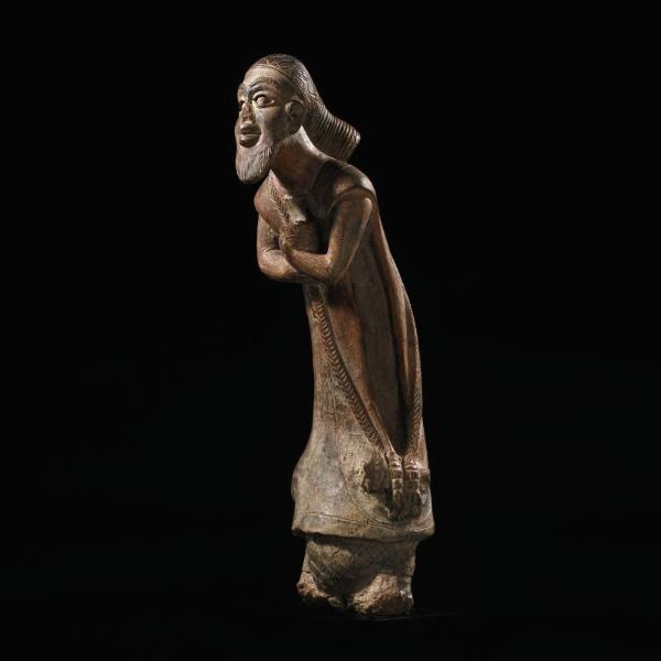 | LOT 103 A TERRACOTTA MALE FIGURE, POSSIBLY CAMEROON estimate 5,000—7,000 USD MEASUREMENTS height 22 1/2 in. 57.2cm DESCRIPTION standing, the fragmentary base supporting the figure arched forward and wearing a tunic and holding a bowl to the front, the face with stylized features including a beard and deeply set almond-shaped eyes and wearing a backswept coiffure; varied reddish to grey surface. PROVENANCE Acquired from Everett Rassiga, 1964 LITERATURE AND REFERENCES Robbins, 1966: figure 214 CATALOGUE NOTE This beautiful terracotta figure was acquired by Mrs. Mellon from the dealer Everett Rassiga in 1964. In her notes, Mellon lists the figure as Cameroon. Another note in her records describes the figure as 'found in Rhodesia, thought to be Cameroon'. Shortly after its acquisition, the work was published in Robbins well-known survey African Art in American Collections (1966). No related terracotta figures appear in the literature on Cameroon. There is a tradition of working in terracotta in Cameroon, in the often highly-stylized pipe bowls, see for example (Harter 1986:13, figures 142, 143). However, no large-scale figurative tradition appears as a pre- cursor to this genre. The morphology of the face relates to those of Cameroon masks: the full cheeks and lips, the U-shaped, striated beard, the deeply-outlined eyes and the arching, striated brows. Cameroon royalty also wear billowing robes. One can place the figure in the context of the other refined and sensitive works of African art from Mrs. Mellon's collection, however, its exact origin remains a mystery and a point for continued research. |