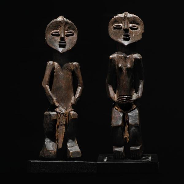 | LOT 140 PROPERTY FROM THE RAYMOND E. BRITT FAMILY COLLECTION A RARE LWALWA PAIR OF MALE AND FEMALE FIGURES estimate 40,000—60,000 USD MEASUREMENTS height of tallest 15 3/4 in. 40cm DESCRIPTION each of similar overall cubistic form, the wedge-shaped feet leading to bent legs, the female with knees extended, the male with inverted knees, with a cloth band encircling the waist, the torsos framed by the pointed, pitched-forward shoulders and arms held out to the sides, the thick necks supporting the highly stylized heads with crescent-shaped facial planes with the protruding lips beneath pointed noses bisecting coffee-bean eyes and wearing deeply grooved backswept coiffures, the male with a hole at the crown possibly for insertion of magic; layered deep red ochre patinas. PROVENANCE Alvin Abrams, New York, December 1976 LITERATURE AND REFERENCES Bradley 1982: 12 & 13, catalogue numbers 8 & 9 Felix 1987: 95, figure 6 Robbins and Nooter 1989: 416, figures 1060 and 1061 CATALOGUE NOTE Lwalwa figures are extremely rare. In the scant literature covering them, the facial features of these figures are often compared to those of Lwalwa masks based on related aesthetic elements. Indeed, as Bradley (1982: 13) posits, the faces of the sculptures reflect Lwalwa concepts of beauty. The Britt pair displays several typical mask characteristics, including the oval, slightly concave face, elongated rectangular eyes, projecting rectangular mouth, pointed chin, and an elaborate coiffure marked by a central ridge. Compare the stance of the Britt pair— showing characteristic bent arms, hands placed on the stomach, and bent knees— with a female figure displaying related features (Timmermans 1967: 89, figure 18A & B). For another figure, which is thought to have been a staff finial formerly in the Bronson collection, see Cornet (1978: 183, catalogue number 99). Lwalwa statuary is uncommon, but pairs are even more rare. According to Felix there are only three known pairs in existence (personal communication). Felix notes that the Lwalwa, as with other peoples of the region, such as the Dinga, always carved figures in pairs. Where single figures are known independently, they are female. These single figures, which Timmermanns suggest were used in women’s fertility rights, may well have been part of a couple at some point in their history. Pairs, even if they do not correspond exactly, were not intended as portraits, but rather as representations of the mythical ancestors — the originators of the Lwalwa. These figures would have been venerated in dedicated shrines. The practice of creating figures in pairs parallels the masking tradition amongst the Lwalwa. While almost exclusively found in the West as individual masks, the masks were originally carved as male and female pairs. |