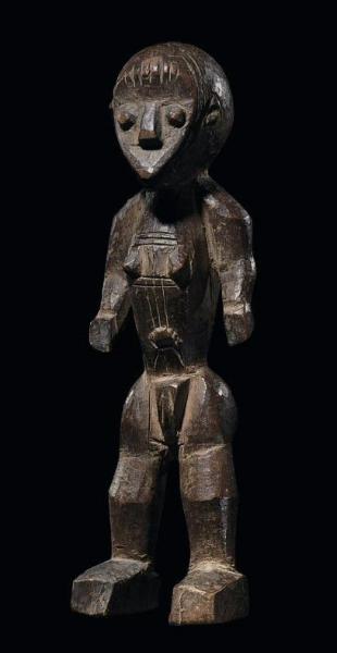 | LOT 110 PROPERTY FROM A EUROPEAN COLLECTION A FINE LEGA FEMALE FIGURE estimate 18,000—22,000 USD MEASUREMENTS height 8in. 20.5cm DESCRIPTION the angular legs tapering to the torso with protruding navel and breasts framed by truncated arms, the sloping shoulders supporting the head with scooped, heart-shaped facial plane, notched mouth and coffee-bean eyes; varied medium brown patina with areas of kaolin. CATALOGUE NOTE Lega wooden figures are rare and served as part of the contents of a basket used during initiation ceremonies. As Biebuyck (2002: 119) describes, '...the essential presentation takes place during the kunanuna masengo rite in lutumbo lwa kindi. The figurines are removed from the baskets together with numerous other manufactured and natural objects, and they are displayed. One by one, sometimes several in a single sequence, the sculptures are picked up by the presentors and danced wiith. For a long time these important figurines were barely represented in world collections. They were jealously kept by the initiates as expressions of their in-group spirit, as major links with the deceased predecessors and as a profound expression of ultimate values and historical interdependencies. Several of these larger wooden figurines represent in their morphology a sort of prototypical icon where form, action and meaning conicide to some extent.' |