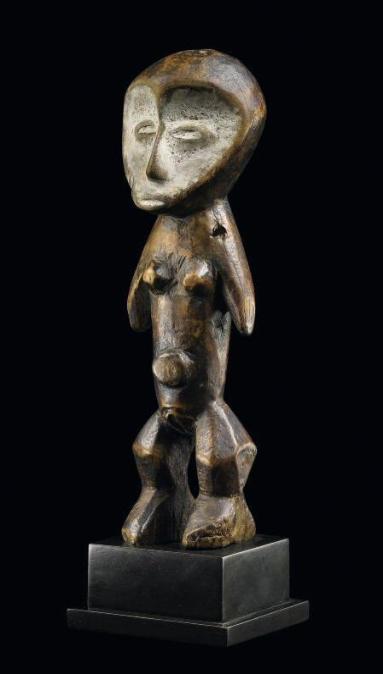 | LOT 113 A LEGA FEMALE FIGURE estimate 5,000—8,000 USD MEASUREMENTS height 11 5/8 in. 29.5cm DESCRIPTION iginga, standing on wedge-shaped feet, the angular legs leading to the waisted torso framed by truncated arms beneath the spherical head with a heart-shaped facial plane; varied redish to medium brown patina. PROVENANCE James Willis, San Francisco, April 1978 LITERATURE AND REFERENCES Bradley, Traditional African Sculpture from the Britt Family Collection, 1982: 9, figure 6, catalogue of the exhibition, Notre Dame, Indiana, The Snite Museum of Art, University of Notre Dame, October 24 - December 19, 1982 CATALOGUE NOTE See Biebuyck (1973: 160-161 and plates 67-71) for related figures. Figures created for the Lega bwami men's society illustrate characters with either good or poor moral values. Bradley (1982: 9) suggests that the Britt figure with her fine scarification, carefully rounded head and drawn-out lower jaw portrays a 'good' woman with positive traits. |