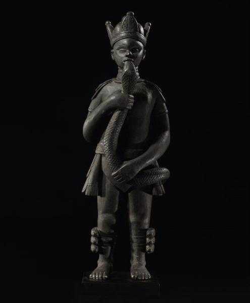 | LOT 31 PROPERTY FROM A BELGIAN PRIVATE COLLECTION A RARE SIERRA LEONE, PROBABLY MENDE, FIGURE AFRICA estimate 25,000—35,000 USD MEASUREMENTS height 34 in. 86cm DESCRIPTION of large proportions, the articulated feet and parted legs supporting the torso in a European military tunic and encircled by a snake held to the mouth beneath the ridged neck and the head with typical full features and upturned eyes and wearing a crown; aged blackened surface layered over green pigment. PROVENANCE British Colonial Collection CATALOGUE NOTE Stylistically this figure shares characteristics with traditional figurative sculpture from the Sierra Leone region, particularly Mende and Temne. The bold stance, full hips, ridged neck, compressed face and uniformly blackened surface situate the figure. See Gottschalk (2005: 130-135) for a comprehensive overview of the current scholarship on Mende and related works of art: See (ibid. :136-157) for related figures most commonly known for use in the context of initiation within the Sande society, placed in personal altars they also have therapeutic or protective functions. The offered figure, wearing a military tunic and royal crown, has obvious elements of European influence. Incorporation of European elements into African iconography dates back to the earliest contact, and is evident in Benin works of art from the 15th century, for example. In addition to the European elements, the snake and the crown are distinct symbols seen in other Mende works of art. When the English came to Sierra Leone in 1885 to declare it a Protectorate, and subsequently bring its colonial rule to an end, Queen Victoria's Paramount Chiefs were given replicas of her crown to acknowledge Britain's presence. These crowns became symbols of independence and were considered, for a long time, prestige objects of the highest rank (Gottschalk 1990: 138). In Mende works of art the meaning of combs, cowrie shells, antelope horns and birds are multivalent. Snakes, however, are a direct symbol of fertility (Gottschalk 2005: 133). According to Gottschalk (2005: 133-34), there is a type of carving known in Mende culture as an 'idle thing' --without purpose other than prestige. It was not unusual for such statues to be used for one’s personal altar or as a prestige object. By 1931 and up until about 1960, leading English colonial officials encouraged the exhibition of these carvings in their meetings with the Paramount-Chiefs to lend the event a special tone. The best work was awarded with prize money given to the carver. The offered figure falls most likely into the latter category of an 'idle thing'. Its marriage of traditional Mende and new European symbols suggest that it was created by a traditional carver both for his own prestige in order to make money by his artistry, and prestige of the one who commissioned and later owned the work. |
