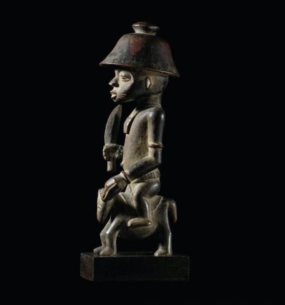 | LOT 61 PROPERTY FROM AN AMERICAN PRIVATE COLLECTION A FINE AND RARE SENUFO EQUESTRIAN FIGURE estimate 20,000—30,000 USD MEASUREMENTS height 13in. 33cm DESCRIPTION the diminutive horse surmounted by the large rider with elongated torso, the finely articulated hands holding the horse's ear, and the right hand holding a curved blade with indigenous repair at the wrist, the head with a sloped facial plane, pursed lips and large downcast eyes and wearing a broad helmet with a nobbed finial; aged and varied deep brown patina. PROVENANCE Harry A. Franklin Family Collection, Beverly Hills Sotheby's New York, April 21, 1990, lot 46 EXHIBITED Hanover, New Hampshire, The Hood Museum of Art, Dartmouth College, Curator's Choice, January 2 - March 10, 1991 LITERATURE AND REFERENCES Cole, Riders of Power in African Sculpture, 1983: number 40, catalogue of the exhibition, Los Angeles, The Los Angeles County Museum of Art, November 23, 1983 - May 6, 1984. CATALOGUE NOTE This equestrian figure is incredibly refined in carving style and sophistication of concept marrying traditional accoutrements of prestige into an equestrian composition. The carver exhibits a wonderful play of scale and proportions in this figure. The rider wears a broad Sudanic helmet that identifies him as a champion cultivator, sambali, 'a title given to those whose strength, perseverence and willingness to endure pain...have earned them the most prestigious honor a man can achieve'. See Barbier, ed. (1993: 26) for a closely related figure, collected before 1939, wearing this type of hat which was made by the farmers themselves. The Senufo 'associate horses with leadership, wealth, status, hunting and militarism. Riders sculpted by Senufo artists are often armed with spears at the ready. They represent the multi-dimensional powers of madabele (forest or 'bush' spirits). In equestrian statuary a bush spirit is shown as a forceful, well-armed leader, or fanhafolo ('power-owner'). Bush spirits are capricious, fast-traveling, nocturnal, mysterious and aggressive.. . .Such figures are display pieces in a diviner's or priest's shrine where. . . they connote luxury, good taste and prestige' (Cole 1983: 11-13). The Franklin figure sends a message of 'double' power in its representation of an equestrian bush spirit clearly imbued with the additional power and skill of a master cultivator. |