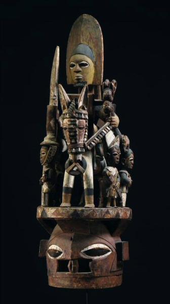 | LOT 74 PROPERTY FROM THE COLLECTION OF MARIDA HINES BRINKWORTH A SUPERB YORUBA EPA HELMET MASK BY BAMGBOYE OF ODO OWO (CA. 1895 - 1978) estimate 40,000—60,000 USD MEASUREMENTS height 41 3/4 in. 106cm DESCRIPTION the janiform helmet pierced at the mouth with large hemispherical eyes and square ears to either side supporting an elaborate superstructure of the warrior-king astride a horse, holding a spear in his right hand and scepter with a bound captive in the left, and wearing a tall, crested hat with a pendant flange at the reverse touching the high-backed saddle and surrounded at the base by four diminutive musicians, each figure with stern features including tightly closed mouths, broad aquiline noses and large, prominently outlined almond-shaped eyes; the whole elaborately decorated with red, white, black and blue pigment. PROVENANCE Collected circa 1956 by Ian Brinkworth, MBE, District Officer, Nigeria (1946-1957) directly from the artist, Bamgboye at his atelier in Odo Owo By descent to the present owner CATALOGUE NOTE William Ian Brinkworth (1914-2000) was born in India to British parents. After his schooling, Brinkworth trained to be a painter at the Slade School of Fine Art, London. With the advent of World War II, Brinkworth joined the military, earning several medals and an MBE (Member of the British Empire). After the war, Brinkworth joined the British Colonial Administrative Service in Nigeria, and over the next 11 years was promoted to District Office and finally to Senior District Officer. During his tenure, Brinkworth took great interest in the local cultures and travelled extensively. He used a specially adapted camping van which allowed him to photograph and document his experiences. Brinkworth developed a good rapport with many local chiefs and collected works of art. In 1956, his penultimate year in Nigeria, Brinkworth acquired what he rightly considered to be ‘the jewel’ of his collection —the offered mask. He purchased the piece directly from the master-carver, Bamgboye, and he documented his encounter with the artist at his workshop in Odo Owo, in the Ekiti region. Upon his return to England, Brinkworth pursued media and lecturing interests before turning to writing. Under the nom de plume Ian Brook, Brinkworth wrote five novels, two critically-acclaimed of which, Jimmy Riddle (1961) and his autobiography, The One-Eyed Man is King (1966), are based in Africa. Brinkworth also wrote numerous essays about African Art, published by The Geographical Magazine and West African Review, amongst others, under the name Ian Brinkworth. The Brinkworth mask is closely related to another well-known Epa mask by Bamgboye now in the collection of the Detroit Institute of Arts. See Kan (1995: 78, number 27) for the Detroit Epa and discussion. The Detroit mask is thought to date from the 1930's. Similarly, Brinkworth recorded that Bamgboye, at the time in his 60's, recounted that he had created the mask as a young man. Based on this account, the Brinkworth mask was most likely carved in the 1930’s. The Brinkworth and the Detroit masks demonstrate the best of Bamgboye's talents in creating a complex composition with a sense of controlled tension. This celebrated carver had orikis, or praise poems, composed to honor his virtuosity as one whose work 'reveals a discipline of mind and hand, ifarabale' (Pemberton 1994: 133). John Pemberton documented an oriki composed for Bamboye, which concludes: The elephant has fled in the face of the hunter. The mighty one has fallen in the forest and can no longer rise. The elephant has fallen; the elephant is gone. The elephant has fallen; the elephant is gone. Ajanaku the mighty one has fallen and can no longer rise. Ajanaku has fallen and cannot climb the mountain. Our father has indeed departed. Well done, son of Olora, who walks majestically. 'Artistry and virtuosity is what is expected of the dancers in an ancestral masquerade when challenged by the lead drummer; the oriki empowers the dancer to be, and the lineage members to perceive, the ancestral presence' (ibid. : 134). Bamgboye himself clearly held the Brinkworth mask in high regard, perhaps as a measure of his artistic insight, oju-inu, having kept it for so many years after its creation. |