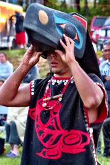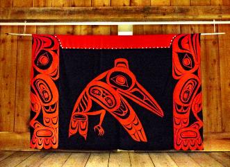from the buttons and red flannel appliqué. Button blankets are worn over the shoulders and the crest