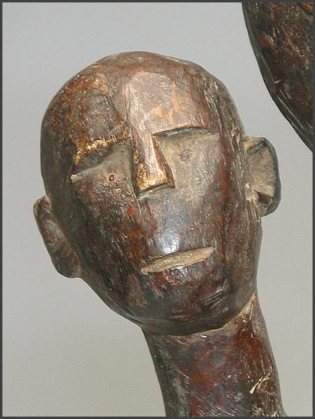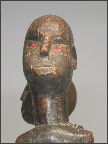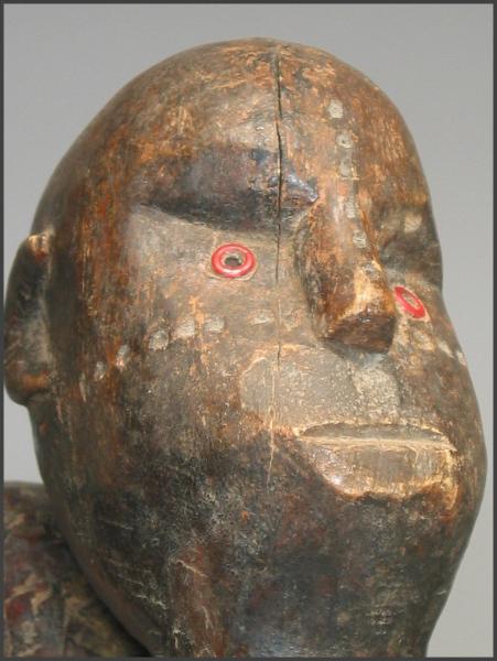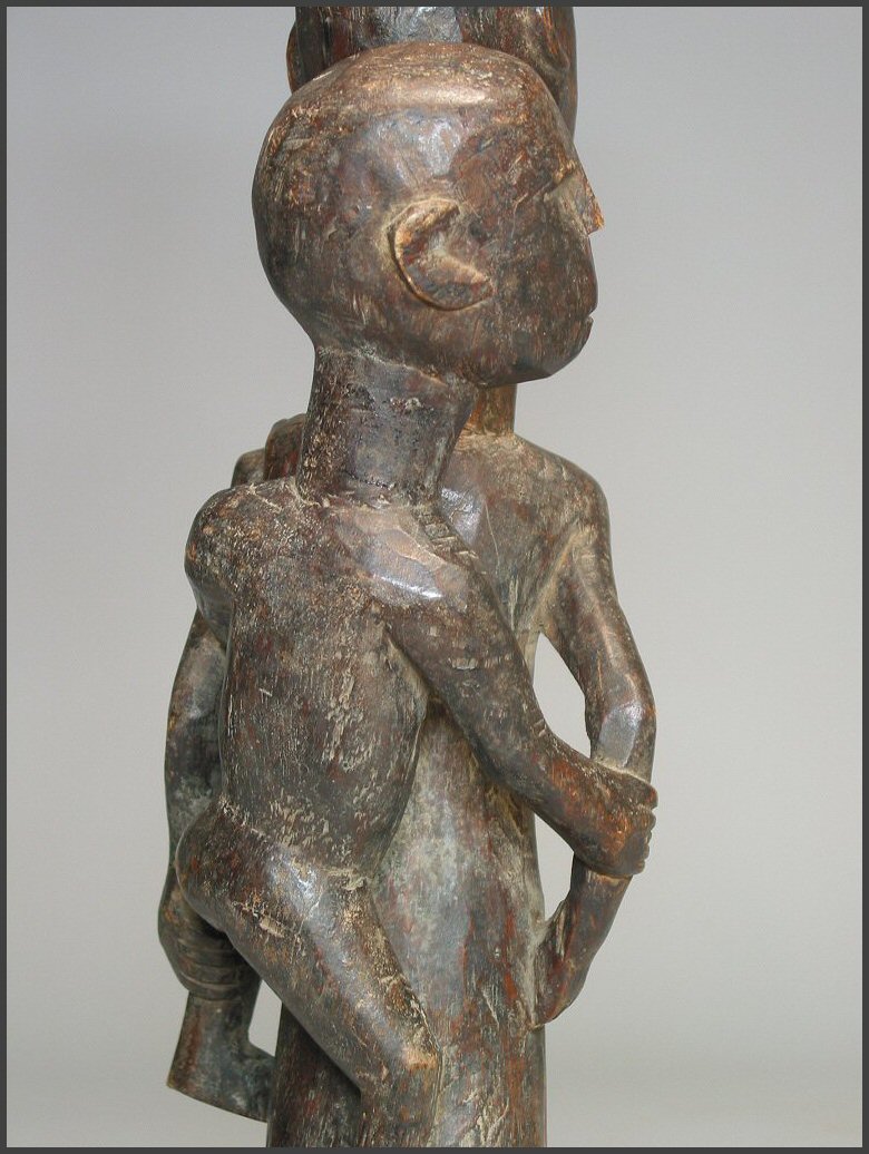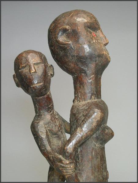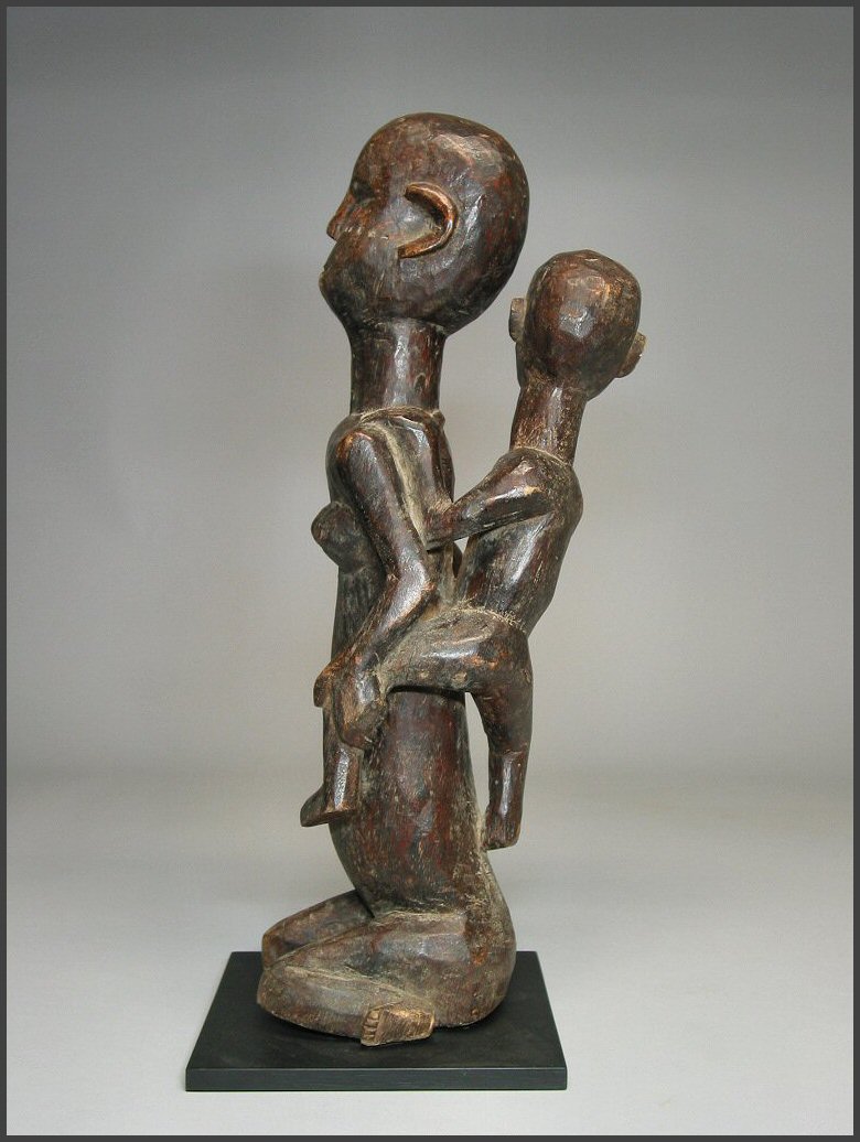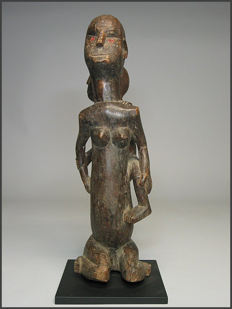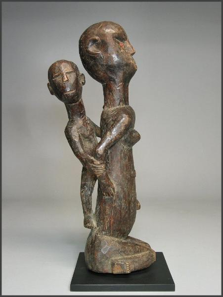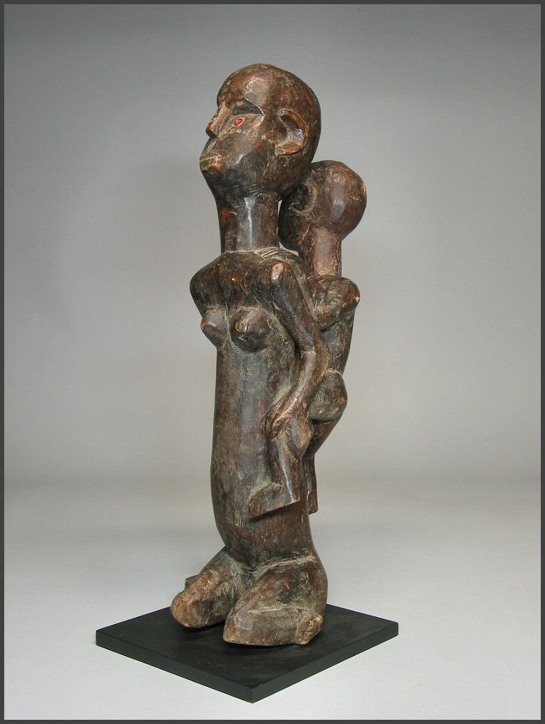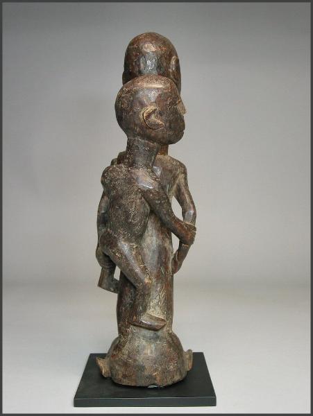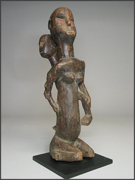 | I really loved the movement in the carving of this particular figure. The child on her back is not your usual "static" child on a mother's back, instead the child has it's own unique character. I liked how the child is holding on to the mother's arm and how the child is looking to the side like it is. The mother is holding the child's other leg and the child is grasping her other arm as well. This figure was acquired from the Jean-Pierre Hallet Collection 19 1/4" tall |
