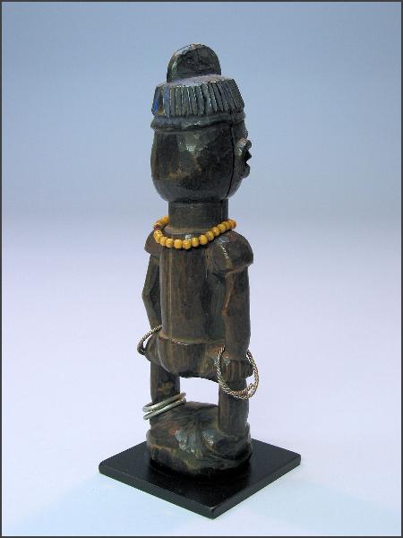 | Ere Ibeji (Ere ibeji - from ‘ibi’ = born and ‘eji’ = two; 'ere' means sacred image) The Yoruba of Nigeria and of the Benin Republic are known for having an extraordinarily high rate of multiple births. The rate of twin births is one of the highest in the world, 45 of every 1,000 births (in the United States it is 28.9 of every 1000). There is also a high mortality rate; half of the twins die shortly after birth. In earlier times, new-born twins, or ibeji, as they are called, were believed to be evil, monstrous abnormalities and infanticide was a common practice. However, such beliefs and practices were later superseded and reversed, and by the middle of the 18th century twins came to be seen as a blessing; theywere awarded the status of minor deities, called Orishas, and their arrival was viewed as an omen of good fortune for the family. By the 19th century the cult of the Ere Ibeji was firmly established and continues to this day. The death of one or both twins is regarded as a great calamity for the family, one which requires immediate appeasement of the soul of the deceased child. The first born twin, whether a boy or a girl, is always called Taiwo, meaning ‘having the first taste of the world’, whereas the second is named Kehinde, meaning ‘arriving after the other’. Although being born first Taiwo is considered as the younger twin. His senior Kehinde is supposed to send out his partner to see what the outside world looks like. As soon as Taiwo has given a signal by crying, Kehinde will follow. Kehinde is supposed to be more careful, more intelligent and more reflective, while Taiwo is believed to be more curious and adventurous, but also more nonchalant (Olaleye-Oruene, 1983; Stoll & Stoll, 1980). Though the cause of the high rate of twin births among Yoruba women has not been established, the cultural grieving process is well documented and may be observed in the carving of a figure known as Ere Ibeji, which both represents the lost child and serves as a ritual point of contact with the soul of the deceased. The carving of the Ere Ibeji is commissioned under the guidance of an Ifa diviner, a Babalowo, whom the parents consult in selecting the particular artist who will do the work. The sculpture itself represents a deceased infant, but is carved with features and attributes of an adult. The sculptural features of genitalia, pubic hair, wide hips, developed breasts, gender specific facial scarification and mature coiffures exude an erotic sexuality, uncommon for infants. Tthe completed ibeji figure is carved as an adult, rather than as the deceased infant, in a mythological form that depicts the concentrated calm of a Yoruba artist. When the carving of the Ere Ibeji is completed, the artist is given a feast and payment as determined by the Orishas. Once the figure is brought to the family dwelling, it is placed on a shrine dedicated to Elegba with the hope that the Orisha or soul, which was split in two parts when the twins were born, will now again reside in the figure that represents the dead twin. The sculpted figure is treated and cared for as if it were alive. It is rubbed in sacramental oil, washed, fed, clothed, sung to and prayed to. It is kept standing during the day, and is laid down at night. Often it will be dressed in the same clothing as the living twin, or be decorated in a beaded vest or shown with raised sandals, indicating possible royal connections. They attend to the figure as if it was their child, they feed and wash it. The headdress will be constantly rubbed with Indigo and the body will be rubbed with red wood powder. And as a sign of dignity (in wealthy families), some Ibedji get pearl cloaks. The responsibility of caring for the ibeji is borne by the mother and female family members of subsequent generations. The sculpture is expected to avert evil from the household, strengthen the manifestations of family love, stare down death, illuminate the pathway through the valley of immortality, and bring good fortune to all who treat it with respect and offer it tokens of affection. Conversely, bad fortune and curses may be engendered if the ibeji is ignored. |