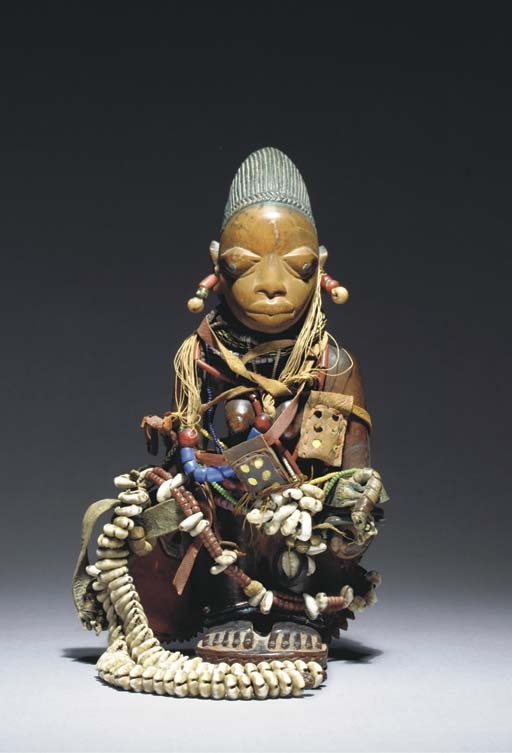 | Sotheby's - New York African, Oceanic and Pre-Columbian Art Auction Date : Nov 11, 2004 Lot 88 : A YORUBA PAIR OF MALE TWIN FIGURES Description ibejis, Igbomina region, each of similar form, with rounded hips, one encircled with beads at the ankles and waist, the arms held to the sides and incised pendants at the chest and back, with softly worn stylized features including jutting chins, full lips and large, diamond-shaped eyes framed by pointed, back swept ears and wearing toque-like, four-pointed coiffures; aged and encrusted blackened patina. Dimensions height of tallest 11 in. 28cm Estimate:$ 3,000 - $ 5,000 Price Realized:$ 0 Provenance PROPERTY FROM AN AMERICAN PRIVATE COLLECTION Acquired in Amsterdam, 1960's |