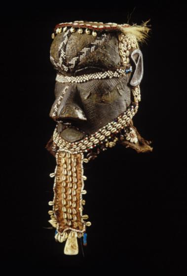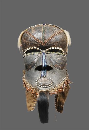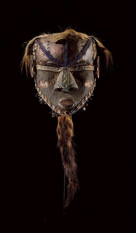 | From the Gelbard Collection Remnants of Ritual Helmet mask, Kuba/Bushoong; D.R.C. Congo Wood, hammered copper, fiber, cloth, beads, shells; H. 14" Helmet masks of this kind are known among the Bushoong as Bwoom. This is one of the three so-called royal masks of the Kuba, the others being the Mwaash a Mbouy and the Ngaady a Mwaash. In reality it seems that the concept of a triad of "royal masks" has been grossly oversimplified. In truth, the Kuba/Bushoong produce a diversity of masks, and many can perform by themselves or in conjunction with lesser known initiatory or village masks. The Bwoom mask is quite possibly the autochthonous mask of the region, with variants in nearly all of the Kuba sub-groups. Though Bushoong folk tales exist to explain its appearance as a pygmy or a hydrocephalic, the mask may have more in common with other large masculine helmet masks dispersed over the wider general area. Unlike other Kuba masks such as the Mwaash a Mbouy, which is usually buried with its owner, the Bwoom may be passed down from one person to another. Thus it is not unusual to find old–in some cases ancient–Bwoom masks still being used by young dancers. This fine old mask has been rebeaded on numerous occasions and displays the more archaic "blindfold" style beading across the eyes, which in more modern examples becomes thin and stylized. |