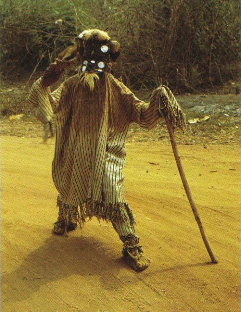 | Northern Edo festival herald, Anogiri; Okpella, Nigeria. Photo: Herbert M. Cole, 1973. (A similar mask and costume are in the exhibition: UCLA MCH X76-1706 and X76-1733a and b, gifts of Mrs. W. T. Davis in memory of W. Thomas Davis, collected by Jean Borgatti.) |